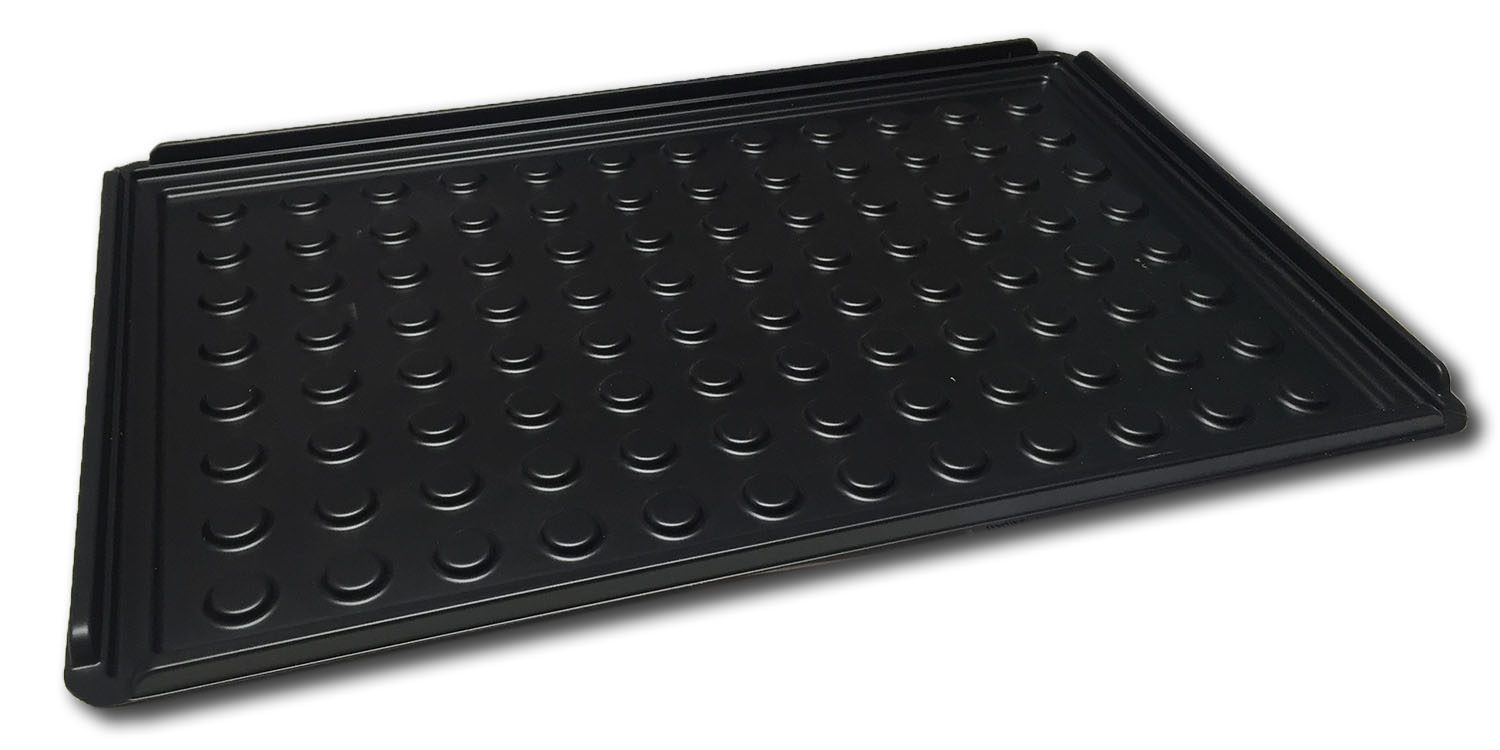 • Attach 4 self-adhesive rubber feet (included with purchase) to the outer corners of the bottom of the black collection tray. This will prevent the tray from sliding.
